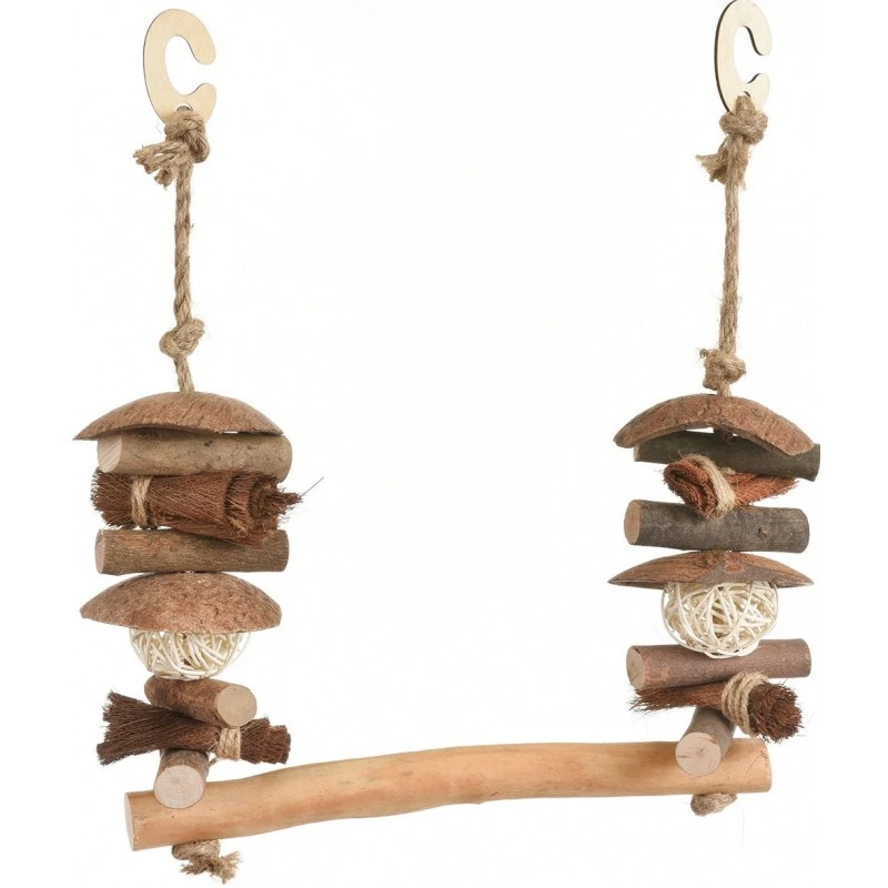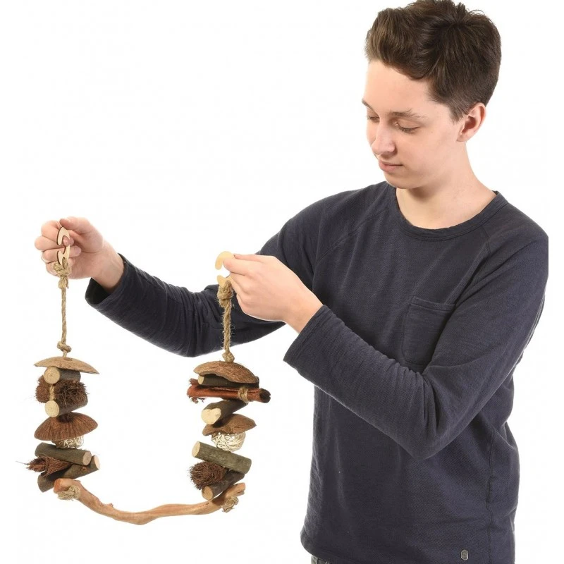 Cette balançoire, entièrement fabriquée à partir de matériaux naturels, offre à son ami à plumes de nombreuses possibilités d’assise, d’escalade et de jeu.