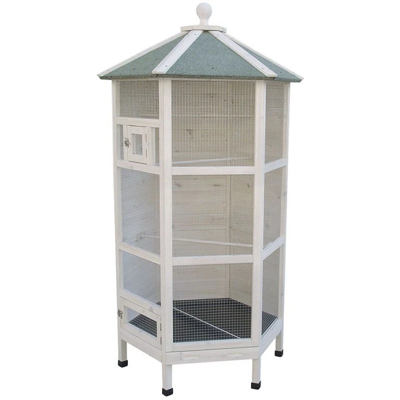 La volière Woodland Hexagon Cottage de Duvo+ est une belle volière confectionnée en pin qui présente une finition de première qualité. La volière est munie de larges portes et de tiroirs coulissants pratiques pour un nettoyage aisé. La volière Hexagon est livrée avec 2 perchoirs. La volière a déjà été traitée une fois, mais nous vous conseillons de répéter périodiquement l’opération pour la maintenir dans le meilleur état possible. Le roofing offre en outre une durée de vie prolongée à la volière.